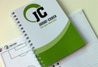 Kredowy papier okładki, metalowa biała spirala po długim boku.